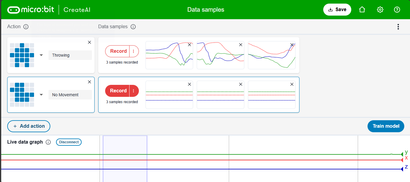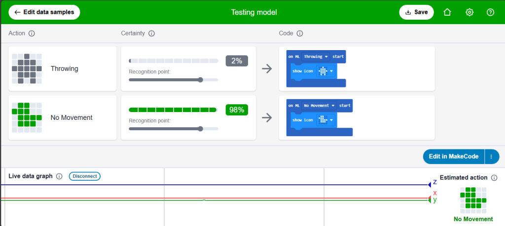 3. Data Collection: Use micro:bit accelerometer via CreateAI to collect three 3-second samples of their selected movement. Classify as “Movement”. Train a 2nd classification called “No Movement” where the micro:bit is stationary.