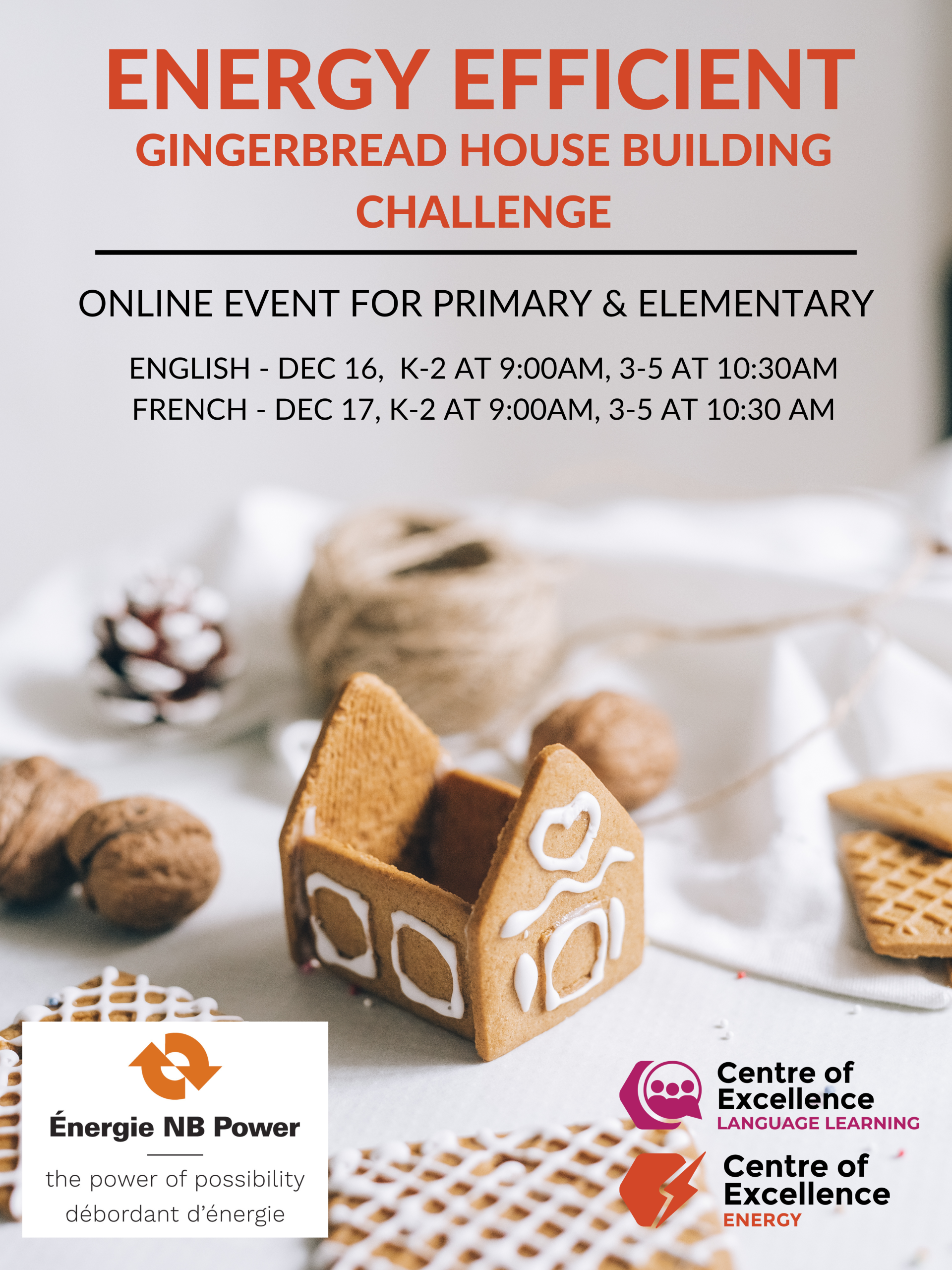 The Centre of Excellence for Energy is happy to announce the 4th annual Energy Efficient Gingerbread House Challenge Live Online Event for K-2 & 3-5 classes. For this event, successful registrations will receive a class kit of gingerbread houses and accompanying materials for students to be led in an activity to build an energy efficient gingerbread house! This year we will be collaborating with the Centre of Excellence for Language Learning to offer sessions in French. There will be a total of four sessions: a K-2 session offered in English, a K-2 session offered in French, a 3-5 session offered in English, and a 3-5 session offered in French.