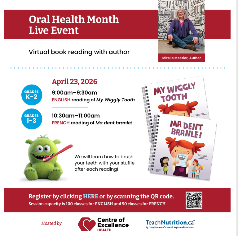 COE Health & Teach Nutrition Maritimes is teaming up for an interactive K-2 English Session and 1-3 French Session on April 23rd.