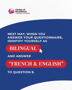 Saviez-vous que le prochain recensement est essentiel pour les services et les informations dont se servent le gouvernement, les municipalités et les communautés ? Si vous êtes capable de tenir une conversation en français (pas besoin d’être parfait) et/ou si vous avez suivi un programme d’immersion en français à l’école, vous êtes considéré comme bilingue ! Jetez un œil à ces questions importantes concernant le recensement sur l’affiche ci-dessous.